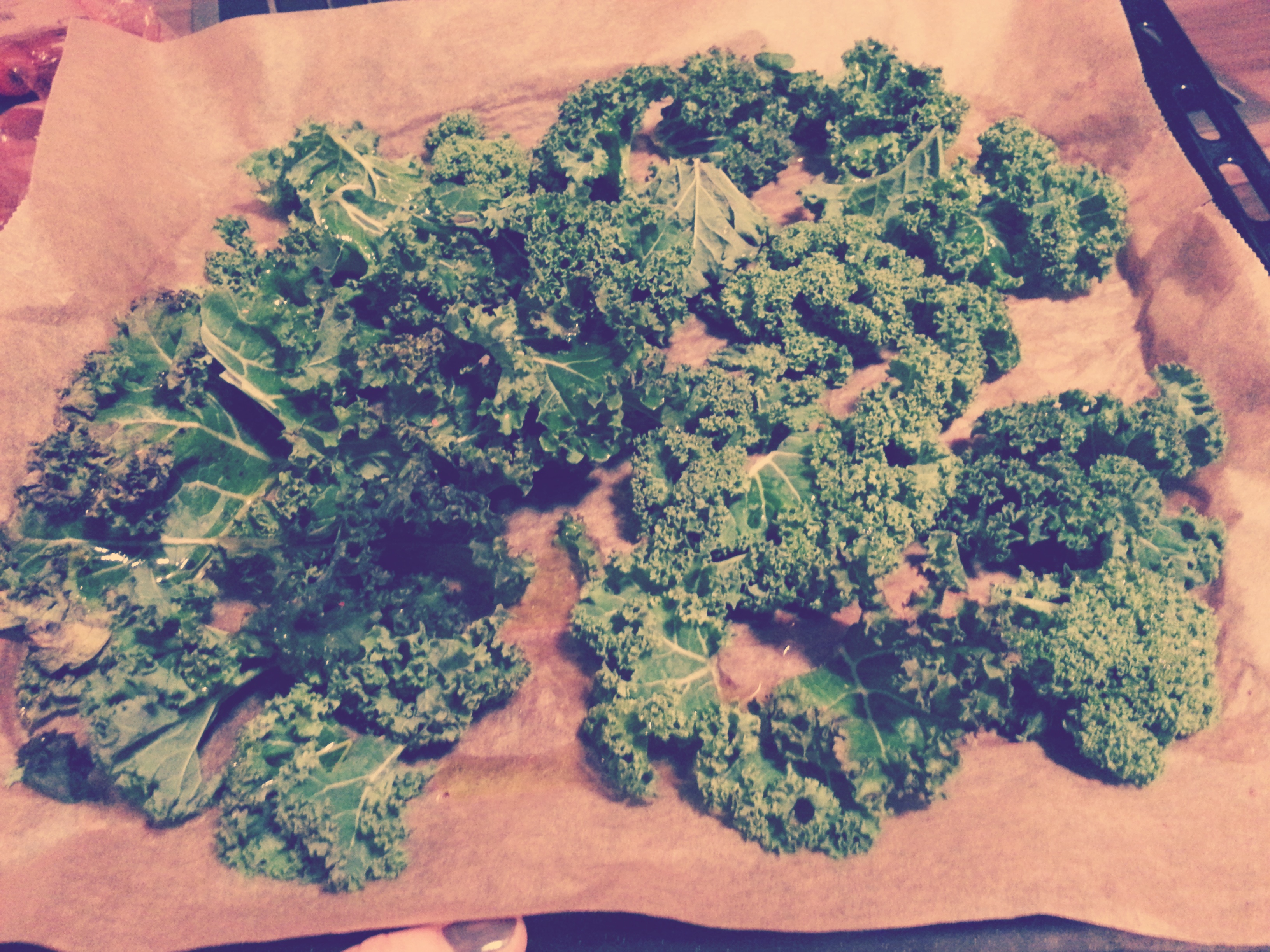 Grünkohl waschen und die Blätter in mundgerechte Stücke zupfen, auf einem Backblech verteilen, mit Öl und Chilli beträufeln.